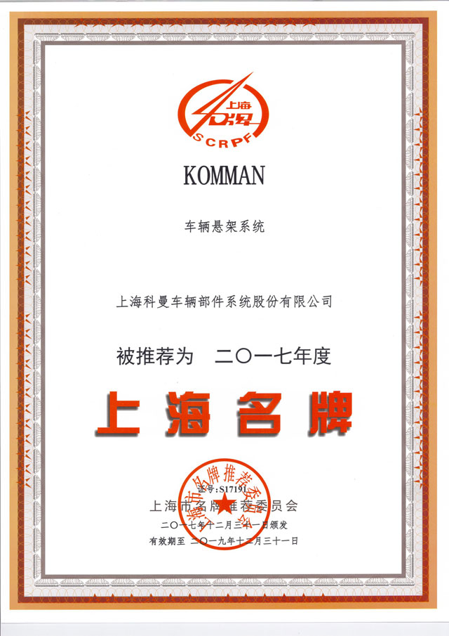 上海科曼車輛部件系統股份有限公司被推薦為2017年度“上海名牌”。有效期自2017年12月31日起至2019 年12月31日止。