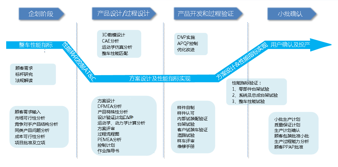 | 上海科曼始終堅持以客戶需求為導向,以“技術的科曼,讓駕乘更舒適”為設計開發理念,為客戶提供******的空氣懸架解決方案。科曼懸架系統產品實現分為四個階段:企劃階段、產品設計&過程設計、產品開發和過程驗證、小批確認。企劃階段主要是以客戶整性能指標要求為基本輸入,對各指標需求進行可行性分析(市場、成本、結構、工藝等)、標桿對標,并確立方案開發計劃。產品設計&過程設計是對項目需求的方案實現,包括系統結構方案設計和工藝過程設計。結構設計主要包括系統方案布置、零部件設計、整車性能指標匹配、DFMEA分析等;產品開發和過程驗證主要是對懸架系統進行臺架實驗和樣車路試驗證。臺架實驗和道路實驗通過后,提交給客戶PPAP,申請轉小批。 |