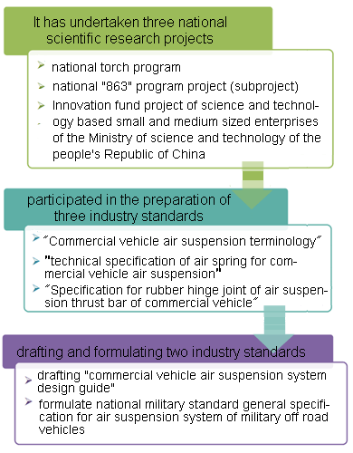 Shanghai Komman has successively undertaken national scientific research projects such as the innovation fund project of science and technology oriented small and medium-sized enterprises of the Ministry of science and technology, the national "863" program (subproject), the national Torch Program project, and participated in the preparation of three industry standards: commercial vehicle air suspension terminology, commercial vehicle air suspension air spring technical specification, commercial vehicle air suspension thrust rod rubber Technical specification for rubber hinge joint; drafting and formulating two industry specifications: drafting the design guide for air suspension system of commercial vehicles and formulating the national military standard general specification for air suspension system of military off-road vehicles.Komman group has obtained more than 130 patents in total, and more than 90% of the applied patent technologies have realized the transformation of independent achievements and achieved good economic and social benefits.